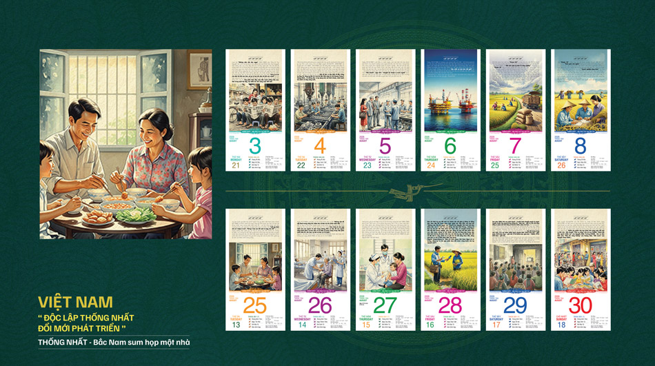 Mỗi trang lịch là một lát cắt lịch sử sống động, được thể hiện sinh động qua những bức tranh đa sắc độ – kết quả lao động sáng tạo của nhóm họa sĩ, Công ty TNHH Grapeshouse. Quá trình minh họa công phu dựa trên việc tham khảo nhiều nguồn tài liệu: sách vở, hình ảnh tư liệu, báo chí, phim ảnh và cả gợi ý từ công nghệ trí tuệ nhân tạo (AI), nhằm mang đến một sản phẩm lịch vừa sâu sắc về nội dung, vừa giàu tính nghệ thuật.
